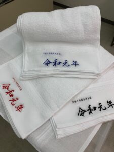 くまさんの「日本一、上質な温泉タオル」に、紺、黒、朱色の三色で「2019年5月1日 令和元年」と入れました。
