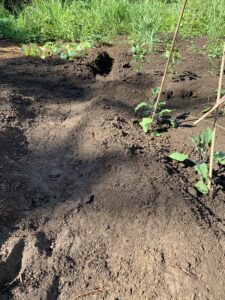 前回の雨で、畑の一部に水が溜まってしまい、野菜たちが大丈夫か、とても心配していましたので、今回は雨予告に従って、雨水の通り道と、溜まらないように窪地をへらすための整地を頑張ってみました。