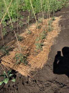 それと、トマトは雨,水に弱いと伺って、今時はマルチというビニールを土に敷くのですが、我が家では自然の農法にこだわり,昔ながらの敷き藁を敷きました。