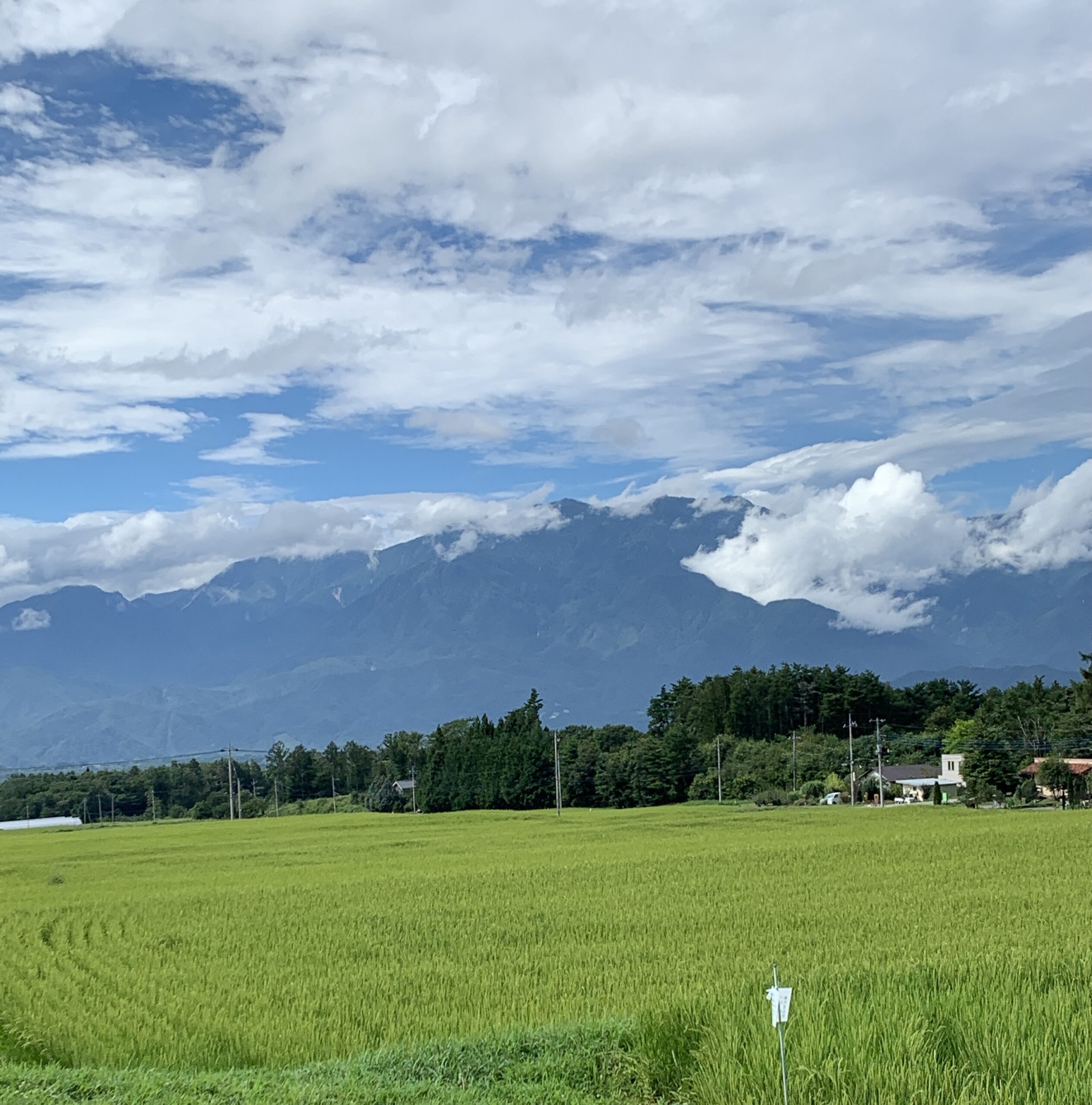 今朝、お店に向かう時、家から畑道を通る途中で、眼下に広がる南アルプスの美しさに目を奪われ、思わず車を止めて撮影しました。