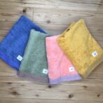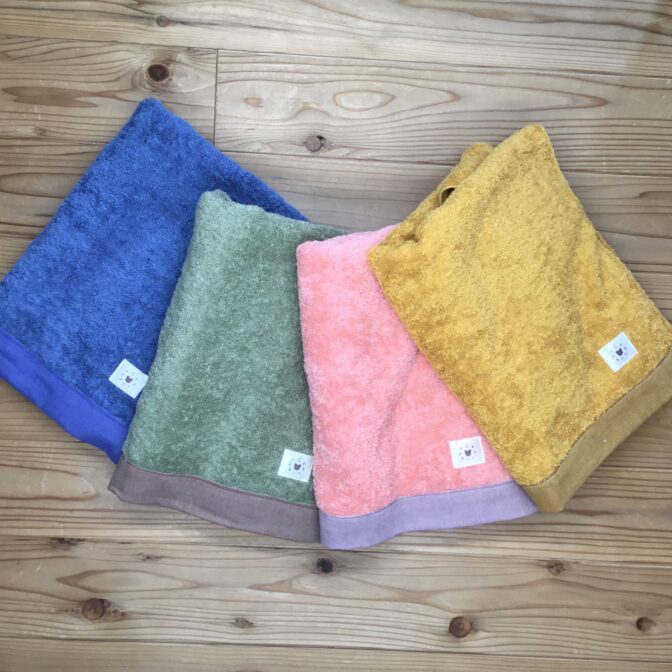 ライオンイエロー・フラミンゴピンク・富士山ブルー・アースグリーンの本体、ヘムに色糸を施した4色展開です。