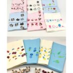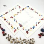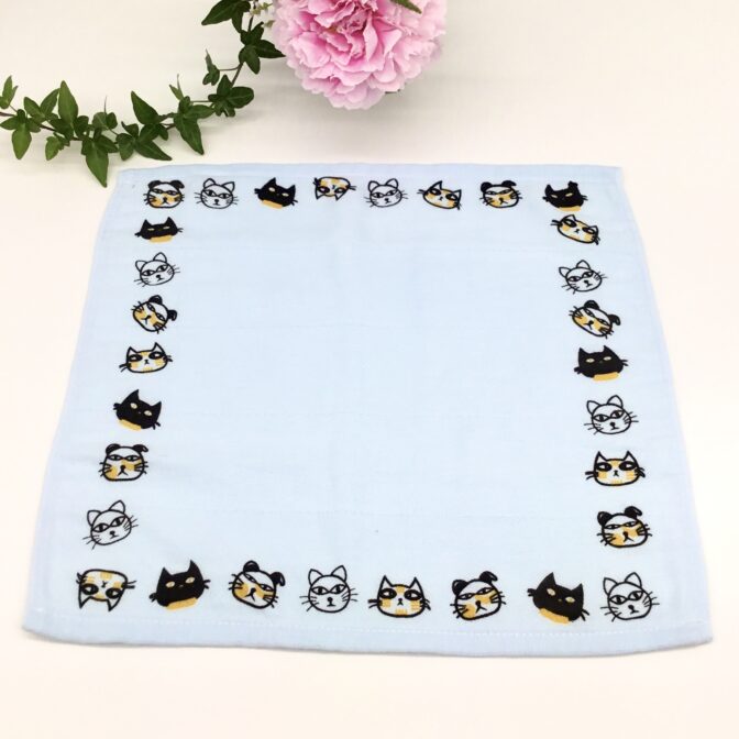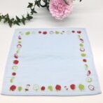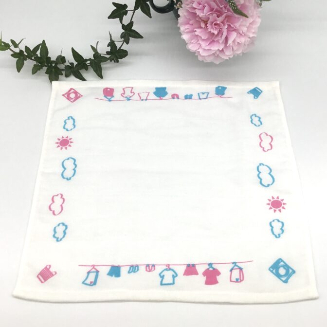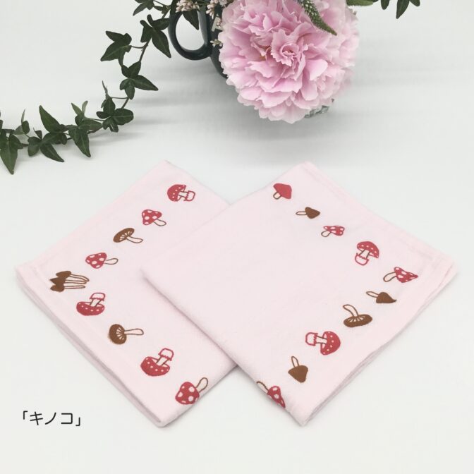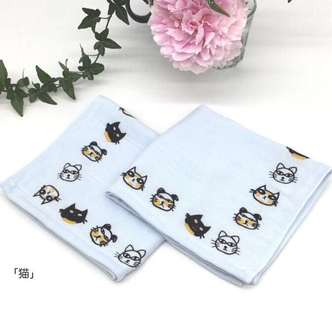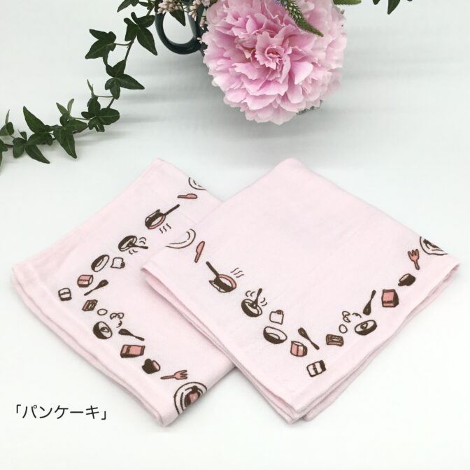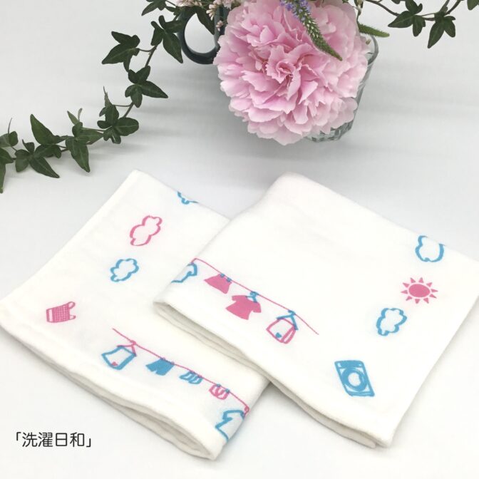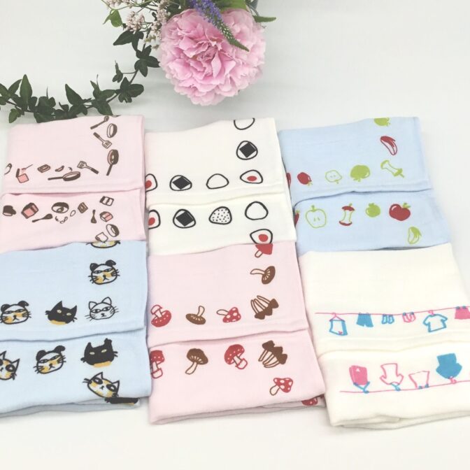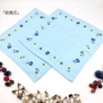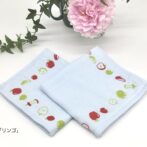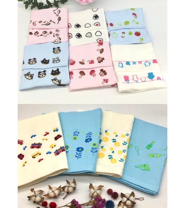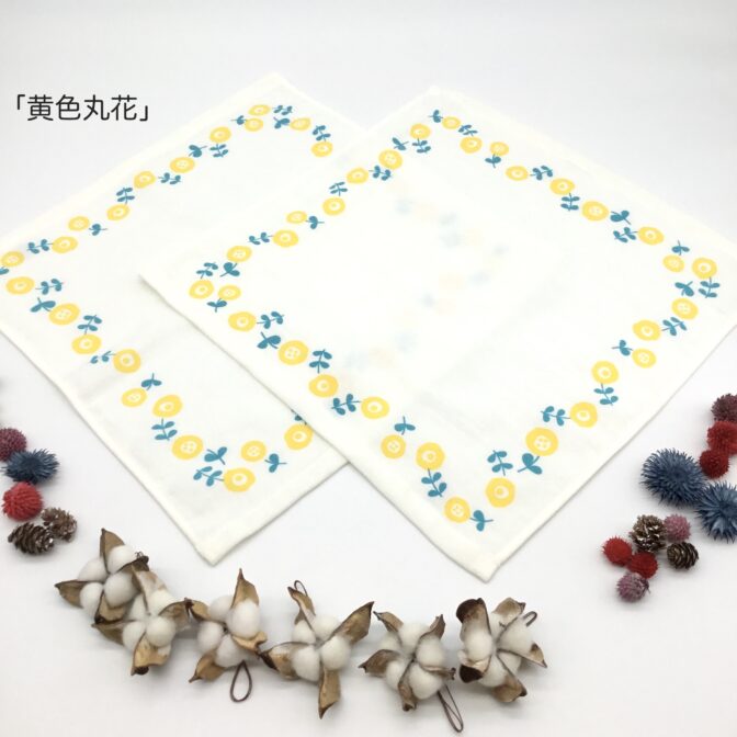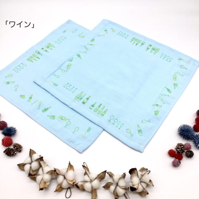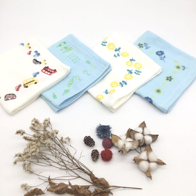 無撚糸ガーゼハンカチシリーズも新たに「車(地の色クリーム)」「欧風花(地の色ブルー)」「黄色丸花(地の色クリーム)」「ワイン(地の色ブルー)」の4デザインが加わり、全10種類になりました。