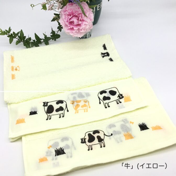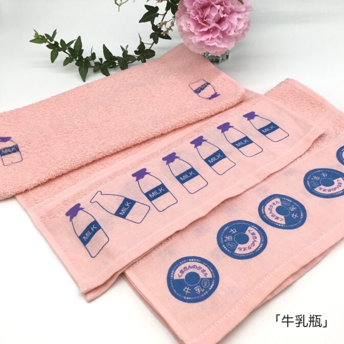 平地の左右は「メインの牛乳瓶」と、反対側の「牛乳瓶のキャップ」更にタオル中央の両脇に「牛乳瓶」を配置しております。