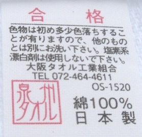 タグにも「大阪タオル工業組合」「泉州タオル」の2種類がありますが、どちらも公式の泉州タオルです。